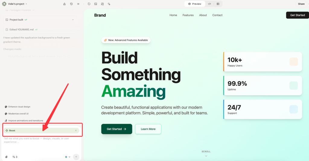 YouWare’s Boost can clean up the visual rhythm: typography, spacing, layout balance, and light animation. It’s useful when you need the dashboard to feel “shippable” without spending hours playing designer.